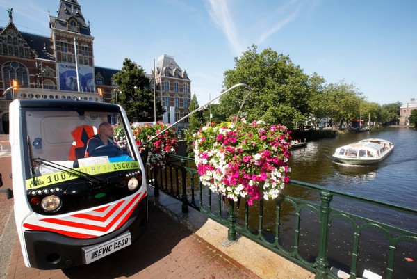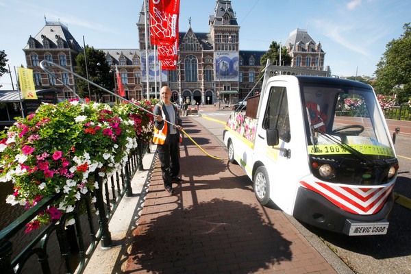De gloednieuwe E-cargo, met een actieradius van 160 kilometer, werkt geluidloos. Chauffeur Marcin kan daarom vanaf βs ochtends 05.00 uur op pad en geeft water zonder geluidsoverlast te produceren voor bewoners of voorbijgangers. De smalle wagen kan probleemloos door nauwe straatjes rijden. Na een proefperiode van 4 maanden is Amsterdam de eerste stad waar de E-cargo volledig wordt ingezet voor de verzorging van hanging baskets en bloempiramides.