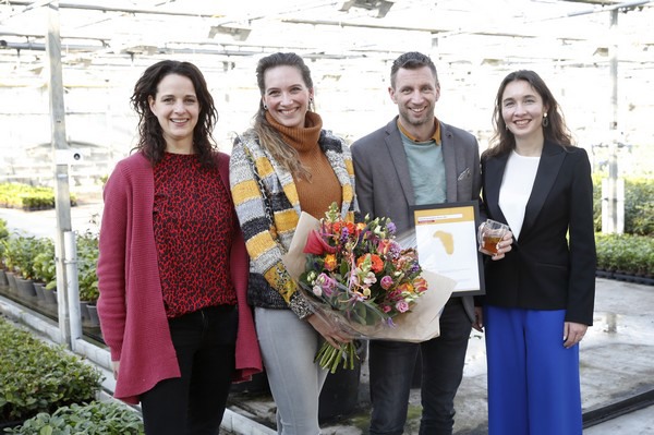 Het is niet de eerste erkenning in de vorm van een titel of prijs voor de theetelers. Hier op de foto overhandigt Anne-Marie Spierings in februari 2020 de Agrofoodpluim van de provincie Noord-Brabant aan Johan (3e van links) en Dionne (2e van links).