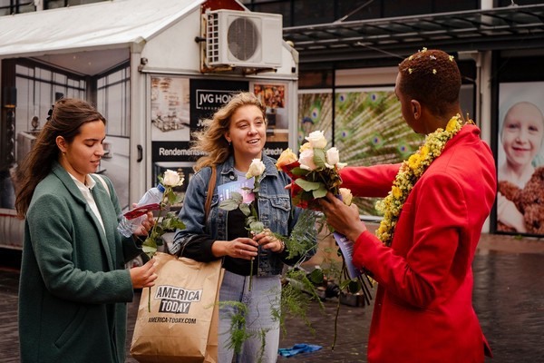 Langs de route worden bloemen uitgedeeld, met een gratis entreekaartje voor deze zomer.