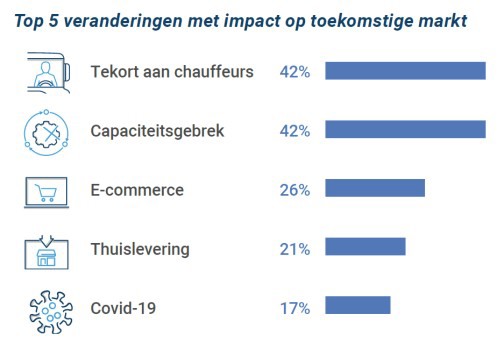 Transportmanagement staat onder invloed van verschillende factoren. Het tekort aan chauffeurs en capaciteitsgebrek zijn het meest dominant, met beiden 42 procent. Verder zijn e-commerce (26%) en thuislevering (21%) bepalend voor veranderingen in de markt. Covid-19 eindigde met 17 procent op de vijfde plaats. Bedrijven investeren voornamelijk in technologie (61%) om zich voor te bereiden op dergelijke veranderingen. Verder is het aanpassen van de transportstrategie (50%) een manier waarmee bedrijven inspelen op trends en ontwikkelingen. Voor toppresteerders, bedrijven die financieel het best presteren binnen de sector, liggen deze percentages nog hoger. Slechtere presteerders focussen vaker op zoeken naar nieuwe transportproviders, op koers blijven en kosten besparen.