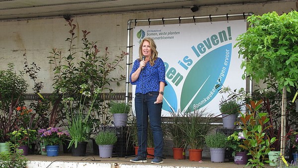 De meteorologe en TV-presentatrice was te gast op De Buurte Kwekerijen en sprak daar de verzamelde kwekers toe - een verslag leest u hier op LTO Bomen en Vaste Planten.