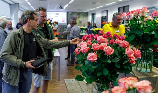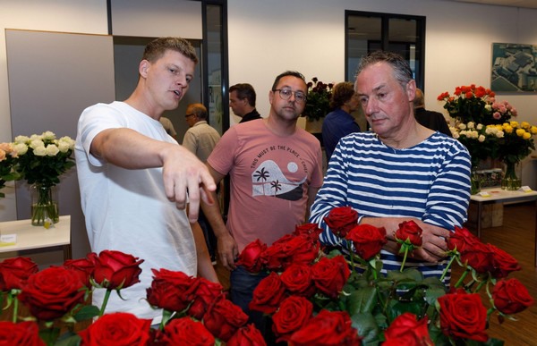 De presentatieruimte van Plantion vulde zich op 8 september met de geuren en kleuren van rozen, de belangrijke ‘omzetknallers’ voor elke bloemendetaillist. Naast bekendere soorten zoals Red Naomi en Avalanche kregen de enthousiaste klokkopers ook minder bekende soorten en enkele noviteiten te zien, waaronder First Gold en Parfume de Grande van Arend Roses.