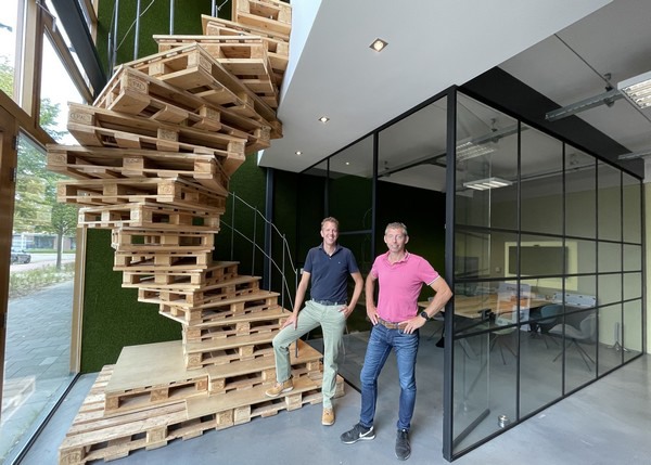 Orance is sinds 27 augustus 2021 te vinden aan de Stoelmatter 7d in Wateringen. Op de foto René en Arno in het nieuwe pand met indrukwekkende pallettrap.