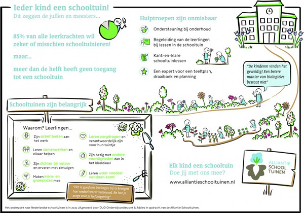 Veel basisschoolleraren zouden graag met hun klas in de moestuin aan de slag gaan, maar hebben hiertoe geen mogelijkheid. Dat blijkt uit het Onderzoek Schooltuinen, dat is uitgevoerd door DUO Onderwijsonderzoek in opdracht van Alliantie Schooltuinen. Momenteel heeft slechts één op de vijf leerkrachten met hun klas een moestuin, terwijl 85 procent aangeeft zeker of misschien te willen tuinieren als hiervoor goede mogelijkheden zouden zijn.