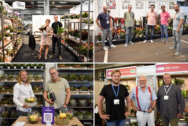 Danielle Vermeulen van Stolk Orchids en Mike Rijnsburger van Stolk Brothers; drukte in de stand bij Carl Sales Support; Dolf van Heijningen geflankeerd door Wim van den Akker en Mark van Velzen van BM Roses; en Martijn Frank en Jan Timmermans van PT Creations