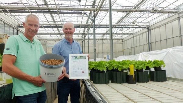 Overhandiging van het RHP-certificaat door Hein Boon, directeur RHP, aan Ronald Keijzer, Hoofd Kwaliteit Substraatbedrijven Lensli.