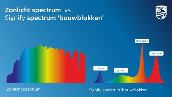 Zonlichtspectrum versus het Signify-spectrum, dat ook verrood bevat.