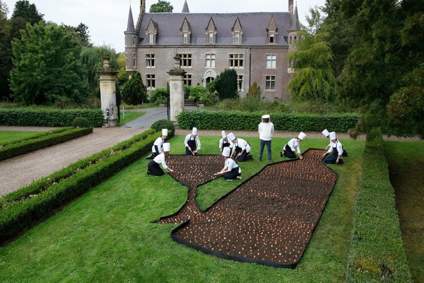 De keukenbrigade van Kasteel Terworm in Heerlen geeft onder toeziend oog van de lokale imker woensdag de nationale aftrap van het bloembollenplantseizoen dat tot eind december duurt.