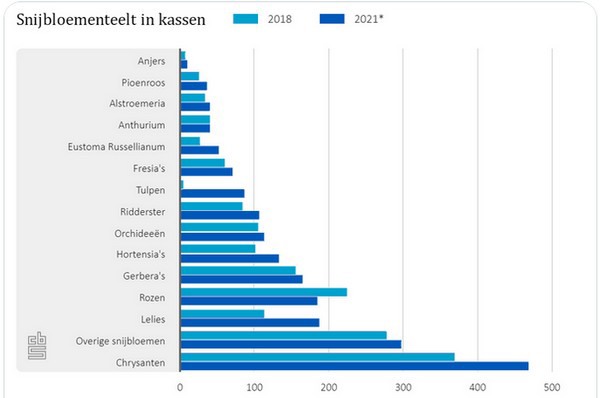 Zoals te zien in de grafiek (een vergelijking met 2018) is de gewasgroep chrysant met zo'n 460 ha vandaag de dag verreweg het grootst. Het kopje 'allerlei' neemt met iets minder dan 300 ha de tweede plaats in, lelies en rozen volgen met zo'n 190 ha (met de aantekening dat lelies de rozen nu net voorbij gestreefd zouden zijn).