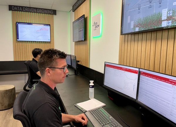 "De controlroom is de eerste week van oktober afgekomen," aldus Miranda van de Ende. "Deze controlroom laat zich vergelijken met een luchtverkeerstoren, het is het kloppend hart van de kas. Hier worden alle data, voortkomend uit sensoren, camera’s en robots uit de kas, overzichtelijk gevisualiseerd en geanalyseerd in het data platform van LetsGrow.com. Deze analyses zorgen er uiteindelijk voor dat de kas ook slim en automatisch kan worden aangestuurd met de IIVO klimaatcomputer van Hoogendoorn Growth Management."