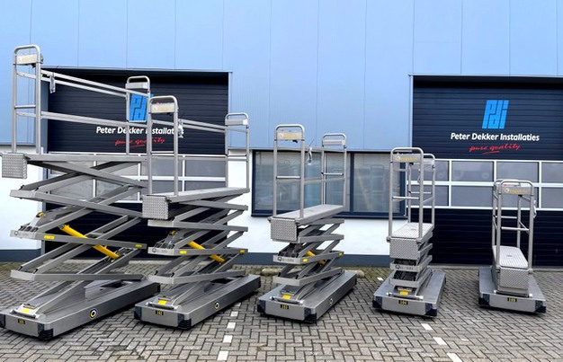 Maar wacht eens even, buisrailkarren voor PDI? Gaat de installateur van scherminstallaties voortaan ook zelf tomaten telen? Dat is niet het geval. Het gaat om de schaarlift Qii-Lift H652, een bekend model van Bogaerts. PDI gaat deze inzetten als onderhoudslift, met een platformhoogte van 6,5 meter.