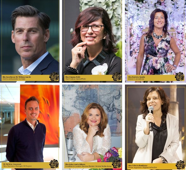 Van linksboven mee met de klok: Willem van Ee, NLse ambassadeur in Italie; Simona Polli, SposaWhite; Patrizia Braida, Bloom's Academy; Valeria Randazoo, Myplant&Garden; Jules Lewis Gibson, Florits' Review Media Group; en Reinier Haasnoot, OZ Export.