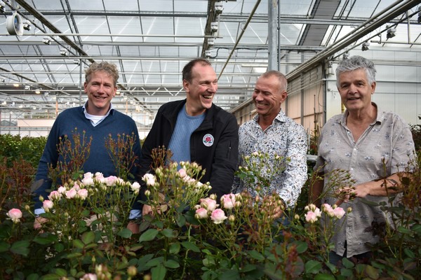 Foto v.l.n.r.: Martijn Ilsink, eigenaar Interplant Roses; Jan Vermeer, inkoper bij Hoven & de Mooij; John Stassen, verkoper bij Fransen Roses; en Aad Fransen, eigenaar kwekerij Fransen Roses.