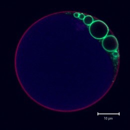 Een met de microscoop gemaakte foto van een cel uit een bloemblaadje van een petunia, afkomstig uit de eerdere studie van Koes en Quattrocchio waarin zij het bestaan van vacuolino's aantoonden. Het buitenste celmembraan is rood gemarkeerd; de centrale vacuole is gevuld met blauwe pigmenten. De vacuolino's zijn voor het onderzoek groen gekleurd. Foto: Copyright: UvA