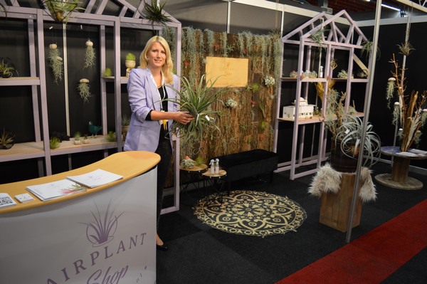 Marleen Zeeman van Airplant Shop, dat met deze wonderlijke niche-plant een dermate succesvolle webshop van de grond gekregen heeft, dat ze er een tweetal extra medewerkers voor heeft aangetrokken. In de hand een Tillandsia Streptophylla.