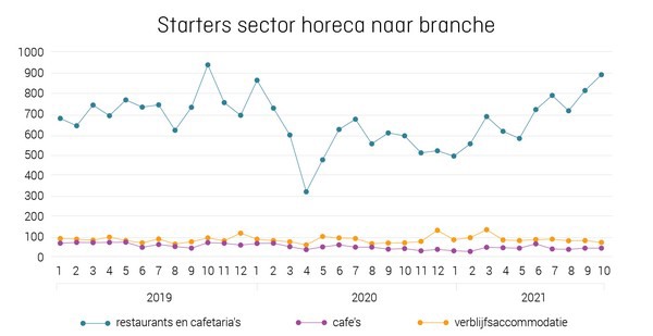 In de horeca is er met 43% meer starters een enorme groei te zien. Van 710 starters in oktober 2020 naar 1012 starters in oktober 2021. De stijging is goed te zien bij restaurants en cafetaria’s (892 starters). Binnen deze branche valt ook de eventcatering op, waaronder veel zelfstandig werkende (freelance) koks, kelners en barista's zijn ingeschreven.