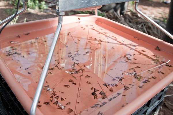 Om te ontdekken of Opogona bij kwekers de boosdoener is van schades, worden feromoonvallen ingezet. Peter begon er zo’n tien jaar terug mee te testen. “Ik ving al snel aardig wat vlinders, maar alleen mannetjes en niet de vrouwtjes.” De vallen waren uitgerust met een waterbak met daarboven het feromoon. “Om beter te kunnen vangen heb ik na menig test besloten het feromoon te vervangen door een UV-lamp. En wat gebeurde er? Ik ving direct in de eerste nacht 50 vinders, mannetjes en vrouwtjes. Vanaf dat moment ben ik het gaan professionaliseren.”