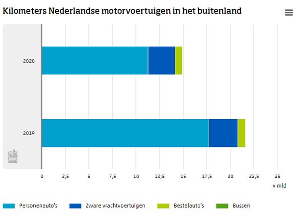 Van alle kilometers in het buitenland werd 76 procent in 2020 afgelegd met een personenauto. Het aantal autokilometers dat in het buitenland werd gereden daalde met 36,3 procent: van 17,7 miljard in 2019 naar 11,3 miljard kilometer in 2020. Het aantal kilometers dat Nederlandse personenauto’s in het buitenland aflegden is hiermee procentueel sterker afgenomen dan de binnenlandse kilometers die tegelijkertijd met 14,8 procent daalden.