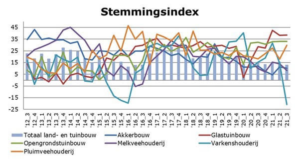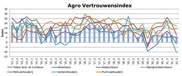 De stemmingsindex, die de huidige situatie op het bedrijf weergeeft, daalde voor de totale land- en tuinbouw met bijna 3 punten en staat in het derde kwartaal van 2021 op 13 punten. Ook nam de verwachting voor de komende 2 à 3 jaar af met ruim 1 punt waardoor er nu net meer ondernemers pessimistisch dan optimistisch zijn over de middellangere termijn van hun bedrijf. De index daalde namelijk net onder nul. Beide indicatoren vormen samen de Agro Vertrouwensindex.