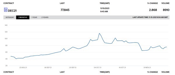 Na een lichte prijsdaling begon de prijs voor gas vanaf 10 november weer te stijgen. Klik hier voor vergroting.