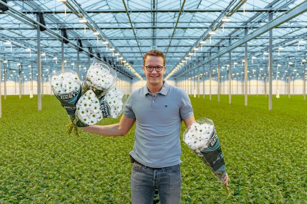 Vanmorgen vroeg waren ze voor het eerst op de veilingklok te verkrijgen: de Kennedy’s afkomstig van de tuin van Janity Flowers. Met een gewicht van 95 gram per steel speelt Jarno van Wijk, eigenaar van Janity Flowers, in op de vraag vanuit de markt. Kennedy is al jaren één van de meest gewilde witte troschrysanten, wat te danken is aan de verfbaarheid, transporteerbaarheid en hoge sierwaarde. Om aan de vraag te kunnen blijven voldoen sloegen veredelaar Dekker Chrysanten en kweker Jarno de handen inéén. Vandaag werd de eerste partij afkomstig van de tuin van Janity Flowers geveild op de bloemenveiling van Aalsmeer en Naaldwijk.