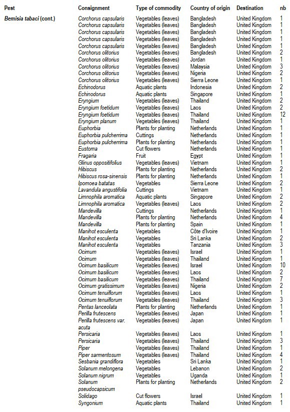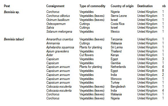 Witte vlieg komt vaak voor in de lijst, het Tomato brown rugose fruit virus (ToBRFV) twee keer (één keer Bulgarije, één keer China).