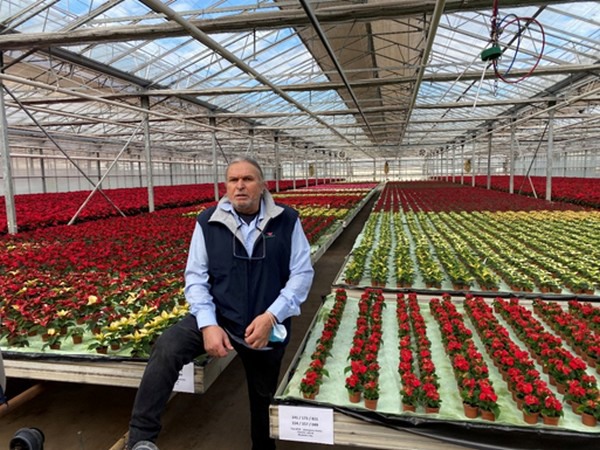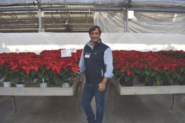 Andrea Lazzeri bij een van de nieuwe Poinsettia-rassen: Maestro Red
