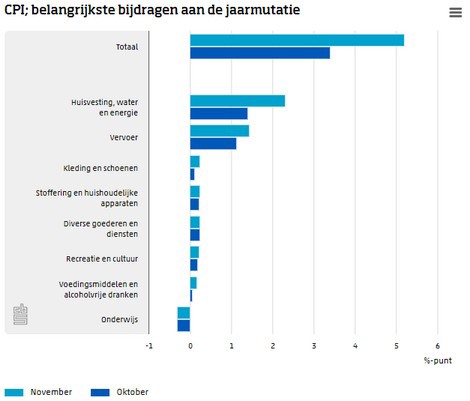 Consumentengoederen en -diensten waren in november 5,2 procent duurder dan een jaar eerder, meldt het CBS. De inflatie in november was de hoogste na september 1982. In oktober was de inflatie 3,4 procent. De snelle stijging van de inflatie is vooral toe te schrijven aan de prijsontwikkeling van gas, elektriciteit, motorbrandstoffen, voeding en kleding.