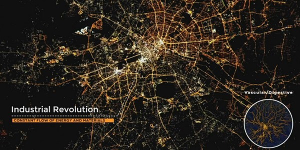 De futurist vergeleek de ontwikkelingsfases in de techniek met die van cellen (rechtsonder)