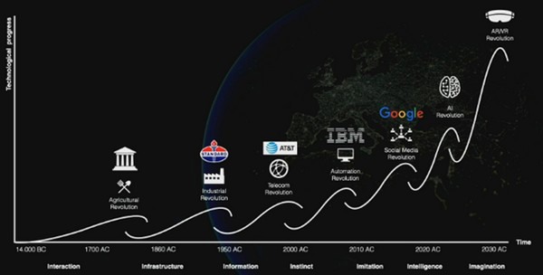 Op dit punt in zijn betoog kwam het model met zeven golven erbij. De futurist liet, de theorie van Darwin volgend, zien hoe het ooit van cellen in zeven fases tot de mens was gekomen. "Vandaag de dag gaan we door dezelfde fases heen, alleen gaat alles nu veel sneller."