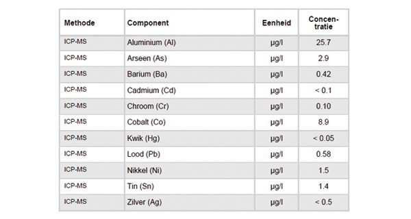 In een geaccrediteerde analyse van Groen Agro Control op zware metalen in grondwater, drinkwater en oppervlaktewater worden 13 metalen geanalyseerd en op een zeer gevoelig detectieniveau in microgram per liter gerapporteerd, volgens onderstaand voorbeeld in demiwater. Maar ook in gewas of grond kunnen deze worden gemeten.Daarnaast kan het bedrijf chroom-6 en selenium detecteren, en ook het niveau van verontreiniging met fluor en jodide bepalen.