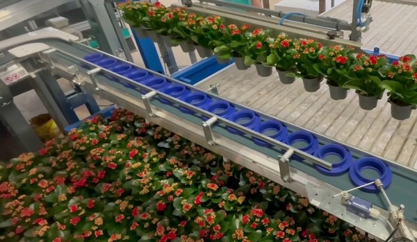 Bij SV.CO stelde collega Rob Overdevest onlangs een nieuwe pottenrobot in bedrijf. Planten gereed voor aflevering rollen uit de kweekruimte op een container de verwerkingsruimte in. Hier raapt de robot ze op en plaatst deze in een cupsysteem van Martin Stolze. Deze transporteert de planten naar het camerasysteem van CODEMA SDF. Het tevens nieuw geïnstalleerde camerasysteem meet de plantlengte en telt het aantal open bloemen, waarna een volgende robot iedere plant voorziet van een hoes.