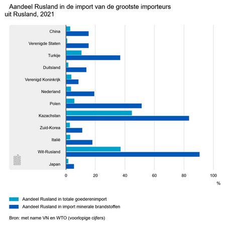 Voor minerale brandstoffen is het belang van Rusland voor alle grote importeurs een stuk groter. Zo is 91 procent van de Wit-Russische import van minerale brandstoffen van Russische herkomst. Voor Kazachstan is dat 84 procent en voor Polen 52 procent. Voor Duitsland (14 procent) en Nederland (19 procent) liggen de percentages lager.