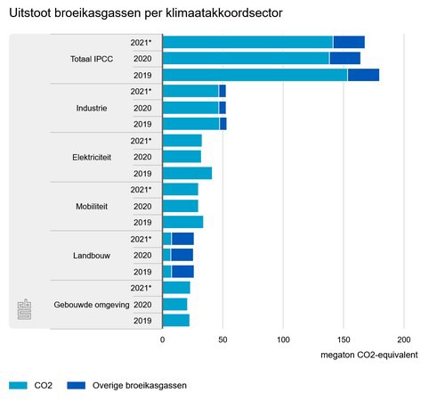 In 2021 lag de uitstoot van broeikasgassen in Nederland 2,1 procent hoger dan in 2020. Daarmee zette de sterke reductie van de uitstoot in 2020 niet door. Toen was er een daling van 8,8 procent. Door de hogere uitstoot in 2021 is de reductie ten opzichte van 1990 op 23,9 procent uitgekomen. Dat is onder de Urgenda-doelstelling van minimaal 25 procent reductie, die in 2020 net gehaald was.