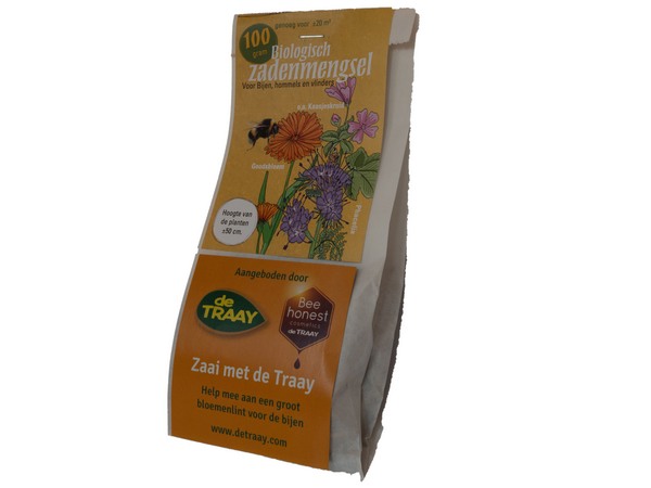 De opbrengsten van de webshop komen geheel ten goede aan de activiteiten van de Bijenstichting. De zendingen worden door vrijwilligers ingepakt. De actie loopt tot en met Nationale Zaaidag op 22 april. Het biologische bloemenmengsel bestaat uit: Boekweit, Borage, Dille, Kaasjeskruid, Korenbloem, Mosterd, Phacelia, Bladrammenas, Goudsbloem, Karwij, Venkel, Koriander, Witte klaver en Incarnaatklaver. Het is geschikt voor bijen, hommels en vlinders. Echt een kadootje voor alle bestuivers.