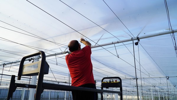 Jozua Lagendijk van Seasun in Kapelle geeft aan dat er diverse ideeën bekeken zijn om de AC-folie te verduurzamen. “Uiteindelijk bleek het beste voorstel om de banen AC-folie aan elkaar te rijgen met plastic lintjes in plaats van nieten. Daarmee hebben we in 2020/2021 de eerste proeven gedaan. Met succes: in november 2021 zijn alle kassen, met uitzondering van 13 hectare belichte teelt, voorzien van deze geregen AC-folie.”
