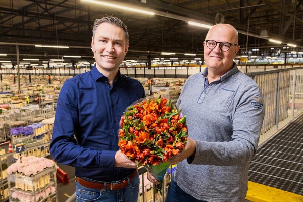 Maarten Goos, algemeen directeur Royal van Zanten, samen met Amerik de Best, veilingmeester bij Royal FloraHolland