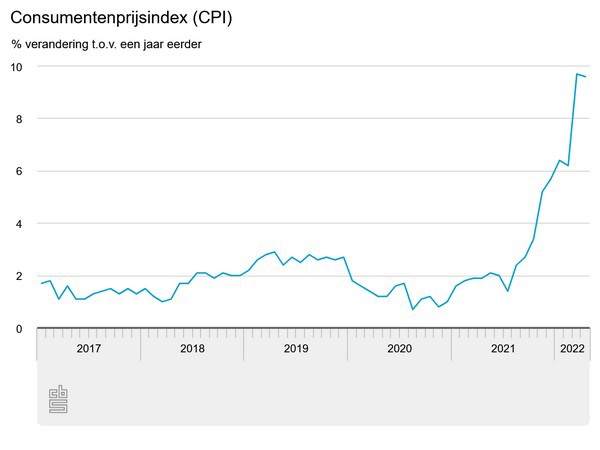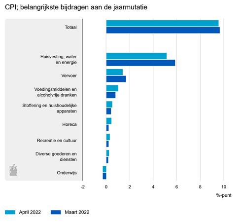 In het nieuws vandaag nieuwe inflatiecijfers. De inflatie in april ligt met 9,6 procent ten opzichte van april vorig jaar net iets lager dan de 9,7 procent voor maart. De prijsontwikkelingen van energie en motorbrandstoffen drukten de inflatie, stelt het Centraal Bureau voor de Statistiek. De prijsontwikkelingen van voeding en accommodaties hadden daarentegen een verhogend effect op de inflatie.