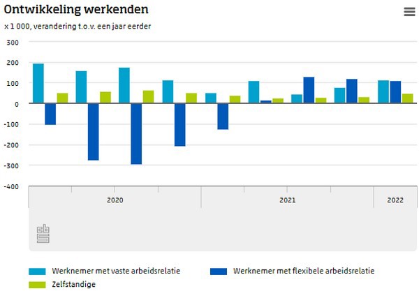 Het aantal werknemers met een flexibele arbeidsrelatie nam in het eerste kwartaal van 2022 toe ten opzichte van een jaar geleden. Vooral het aantal flexibele werknemers met relatief meer zekerheid, zoals mensen met een tijdelijk contract met uitzicht op een vast contract, was hoger; er waren juist minder oproepkrachten. Ondanks de toename met 111 duizend is het totaal aantal werknemers met een flexibele arbeidsrelatie nog steeds 17 duizend lager dan net voor de coronacrisis. Dat melden het CBS en TNO op basis van een gezamenlijke analyse van de nieuwste gegevens over flexibel werk in Nederland.