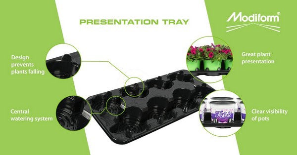 Tegenwoordig zijn potten een onderdeel van de uitstraling van de plant. Er wordt steeds meer aandacht besteed aan de potbedrukking, maar helaas komt het vaak niet tot zijn recht omdat de potten in transporttrays worden gepresenteerd. De bedrukking is dan niet zichtbaar. Dus waarom geen verlaagde voorzijde? "Een goed idee, maar een uitdaging qua uitvoering," vertelt Lisa van Koningsveld van Modiform. Een aantal jaar geleden hebben zij de zogeheten presentatietray aan hun transporttray assortiment toegevoegd en recentelijk hebben ze een nieuwe presentatietray geïntroduceerd.