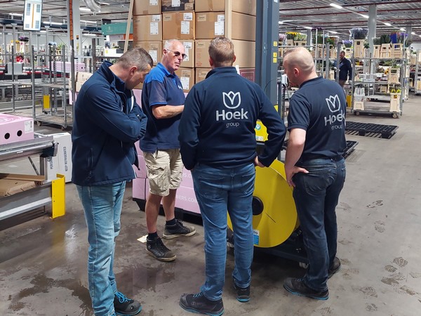 Hoek group is een van de eerste bedrijven in de bloemen business die het overgrote deel van het bedrijfsproces heeft geautomatiseerd. Zo worden emmers met bloemen via honderden meters lopende band vervoerd door het bedrijf. Veel van deze bloemen worden verpakt in kartonnen dozen, zodat deze niet beschadigen. Vervolgens worden deze dozen gestapeld op pallets. Voorheen werden deze pallets met hoeklatten en plastic plakband vastgemaakt. Echter werkt dit volgens Dennis van Hoek group niet goed: ‘Het plastic tape blijft aan de dozen vastplakken, waardoor de barcodering en uitstraling van de doos worden beschadigd bij het losmaken van het tape’. Daarnaast is volgens Marco van Hoek group het plastic tape niet stevig genoeg: ‘Het plastic tape gaat niet strak om de pallet en heeft te weinig draagkracht. Hierdoor zijn de pallets instabiel tijdens het transport.’ Om deze problemen op te lossen heeft Hoek group gekozen voor twee Reisopack 2830 omsnoeringsmachines van Steenks Service. Hiermee is Hoek group het volgende bedrijf in de bloemen en planten industrie dat af stapt van het gebruik van plastic tijdens logistieke transport.