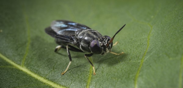De zwarte soldatenvlieg (boven) en de larven (onder)