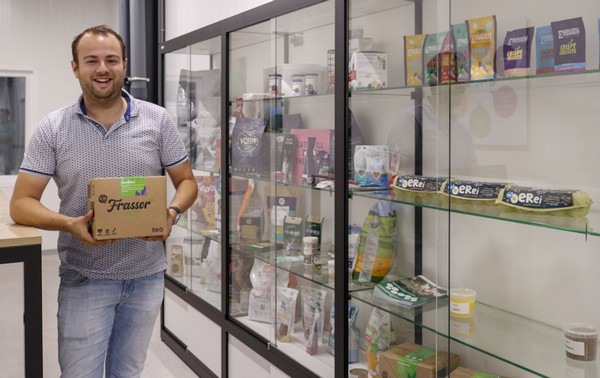 Thijs voor een stelling vol met producten op insectenbasis, waaronder het OERei