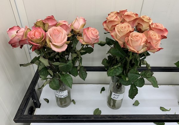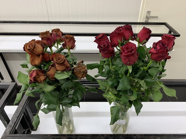 Zowel boven als onder, onbehandelde rozen vs. gedipt in Chrysal Rose Dip. De behandelde exemplaren hebben geen botrytis, hebben hun kleur behouden of zelfs verdiept, openen uniform en hebben een langer vaasleven.
