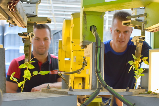In de tijd waar de werkhandjes moeilijk te vinden zijn, is deze machine een waardevol iets. “Zo besparen we ieder uur zon 6 personen, doe dit maal gemiddeld 100 uur in de week en reken maar uit! Een machine draait net zo goed aan het einde van de dag als aan het begin, wordt nooit ziek, is altijd op tijd en heeft geen vakantie nodig. Daarbij heb je maar twee man nodig om deze lijn van vier robots te bedienen en we tot wel 5200 stekken per uur kunnen knippen en steken. We brengen onze kwaliteit op deze manier naar een heel hoog en constant niveau. In de twee weken dat we alles met de hand deden was het verschil duidelijk zichtbaar in het gewas. De menselijke factor is eruit en elk stekje wordt tot op de millimeter precies hetzelfde gestoken,” concludeert Pieter.