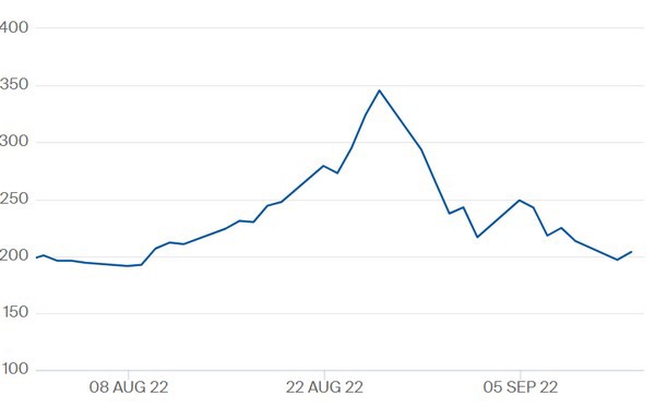 De gasprijs voor 'winter 2022' tot en met 13 september op de Title Transfer Facility. Voor de resterende maanden van 2022 lag de gasprijs tegen 11u woensdagochtend tussen de 210-215 €/MWh. Bekijk hier de actuele cijfers.