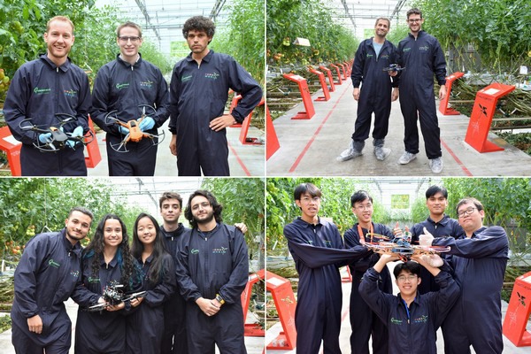 In totaal tien teams, waaronder veel internationale studententeams maar ook enkele dronebedrijven, stonden op de rol voor vlucht. Stonden, want naarmate de wedstrijddag naderde, moesten enkele teams toch afhaken. Soms vanwege coronaproblematiek of spijtig genoeg het verliezen van een drone in de kofferchaos op het vliegveld, soms ook omdat eenmaal bij testen in de kas de drone de uitdaging toch nog niet aankon.Van links boven met de klok mee: team Corvus uit Nederland, team Selff uit Israël, team SkyRats uit Brazilië en team Ciiba uit Thailand