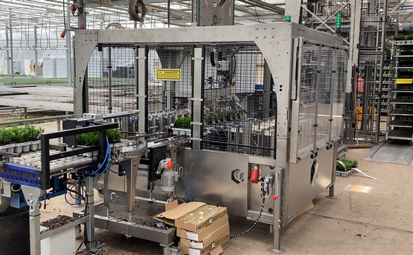 “Nadat de trays met beugels verenkeld zijn, worden ze doorgevoerd naar een Crea-Tech karrenlader die het zware werk op moeilijke hoogtes elimineert en snel en geschikt is voor karren met opzet- stukken. Omdat we weten dat karren nooit recht zijn worden de karren van meerder kanten ingeklemd. Vervolgens worden de planten vanaf de invoerband eerst in een bak geschoven. De bak beweegt in de kar zodat de planten niet over de kar platen schuiven. Hierdoor is de machine ook ongevoelig voor beschadigde platen en is het ook mogelijk om losse potten in de kar te laden.”