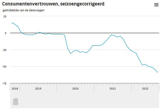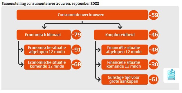Nederlandse consumenten waren in september somberder dan in augustus, waardoor voor de vijfde keer dit jaar het laagterecord van het consumentenvertrouwen werd verbroken. In september kwam het vertrouwen uit op -59, tegen -54 in augustus. Consumenten waren nog nooit zo negatief over de economie en hun financiële situatie.