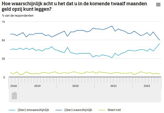 In september vond 46 procent van de respondenten het onwaarschijnlijk of zeer onwaarschijnlijk dat zij geld opzij zouden kunnen leggen in de komende twaalf maanden. Dit is het hoogste percentage sinds het begin van de tijdreeks in 2017. Het percentage dat wel dacht geld opzij te kunnen leggen daalde naar 50. Verder vond 85 procent van de respondenten dat de prijzen in de afgelopen twaalf maanden sterk zijn gestegen. Ook dit is een record.